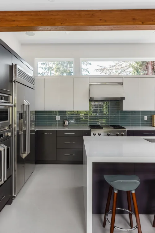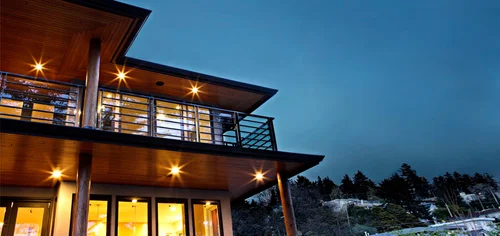 A keen sense of environmental awareness was present when designing this sustainable and stylish home. Elements of concrete, steel and naturally finished woods compliment the West Coast surroundings. Solar thermal panels capture renewable energy while foam insulation with open cell technology ensures maximum indoor air quality & energy efficiency. LED lighting and low VOC paints were used throughout. All millwork and mouldings, including the Italian glass kitchen are formaldehyde free. Recycled materials were used for deck surfaces and all waste produced from the project was also recycled.