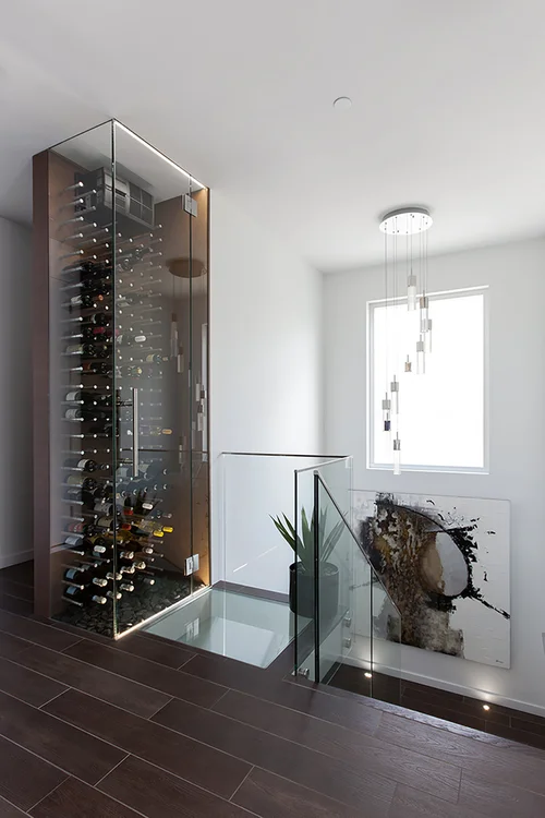 This elegant and modern home, situated on a challenging sloped lot, was designed with a focus on glass, concrete, warm walnut and stainless steel. At only 22 feet in width, and 4300 square feet of dramatic finishes, each floor is connected by a floating walnut staircase and an elevator concealed by walnut paneling in the entrance. Expansive and serene views of the ocean stream through oversized windows, with outdoor spaces incorporating water and fire elements. A sleek and functional kitchen sits at the centre of the home, offering an ease of maintenance and efficiency which was paramount to our clients. Modular art wall panels and stainless steel accents were integrated to capture the fluid motion of a wave and can be seen in the flexible slate on the contoured fireplace. The foyer and outer decks also display this sense of movement.